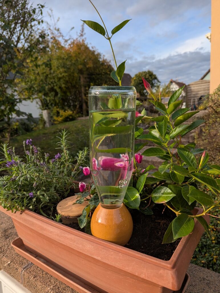 Pour les ollas à planter, vous pouvez insérer au sein de votre olla une bouteille (en verre de préférence) remplie d’eau. Vous augmentez ainsi considérablement le temps de diffusion et pourrez partir sereinement en vacances. Attention toutefois à bien enfoncer votre olla à planter dans la terre afin que la bouteille ne risque pas de se renserver. (voir photo ci-dessous).